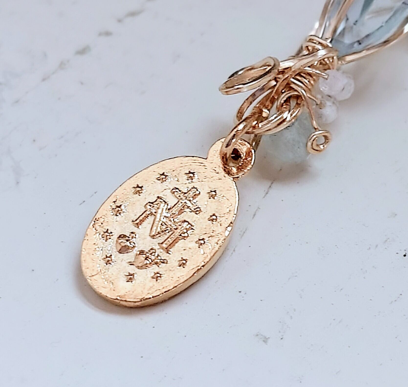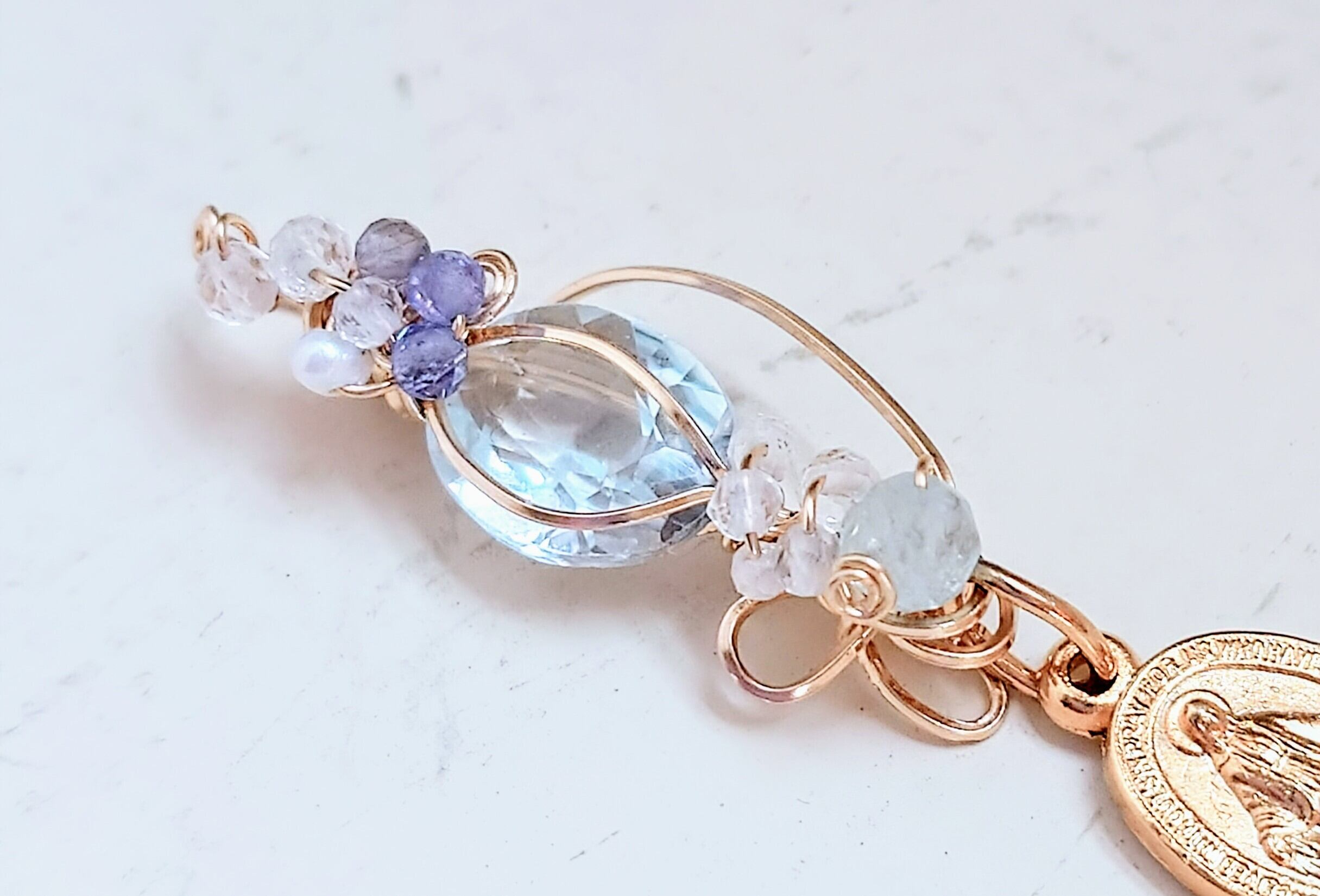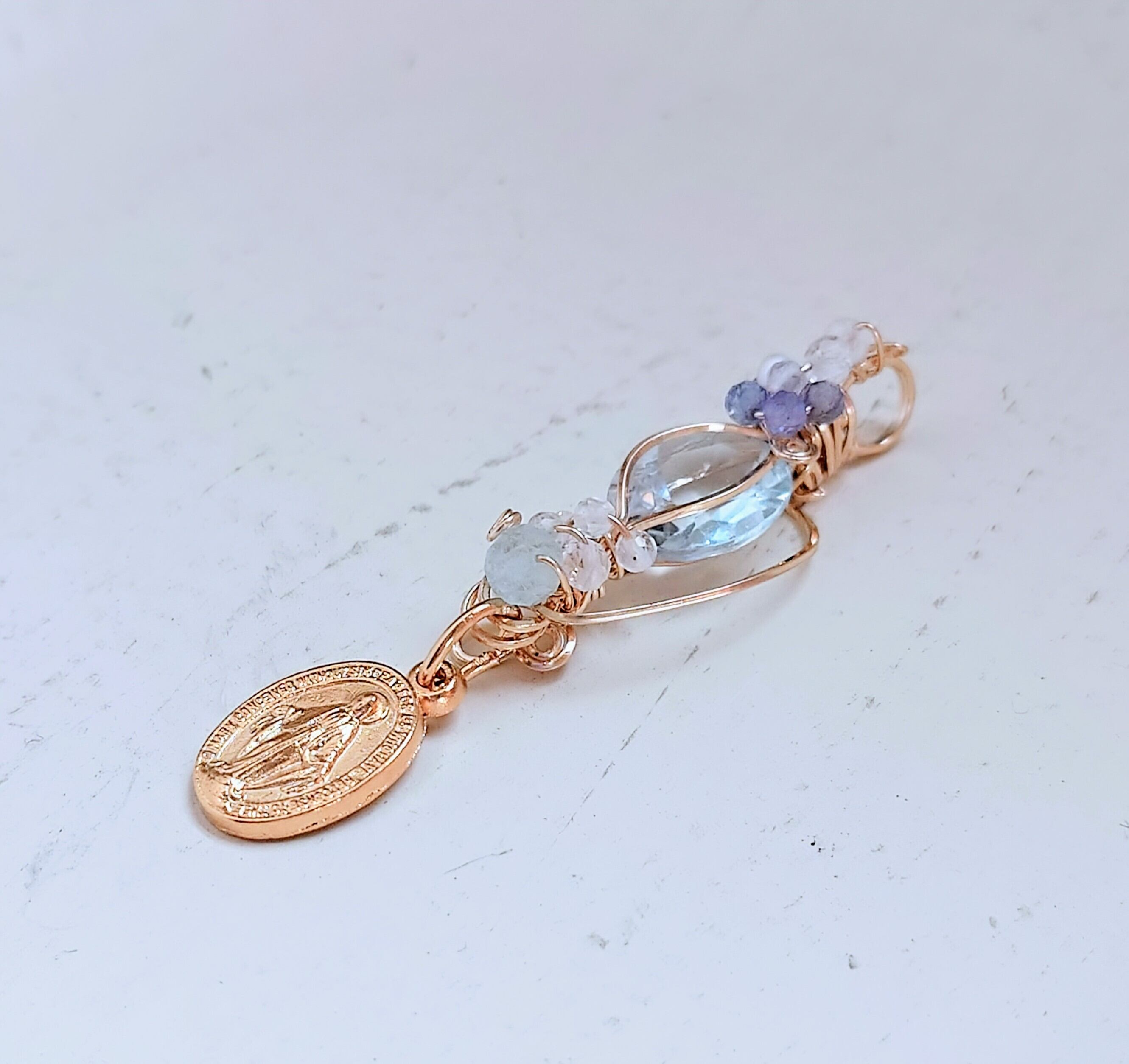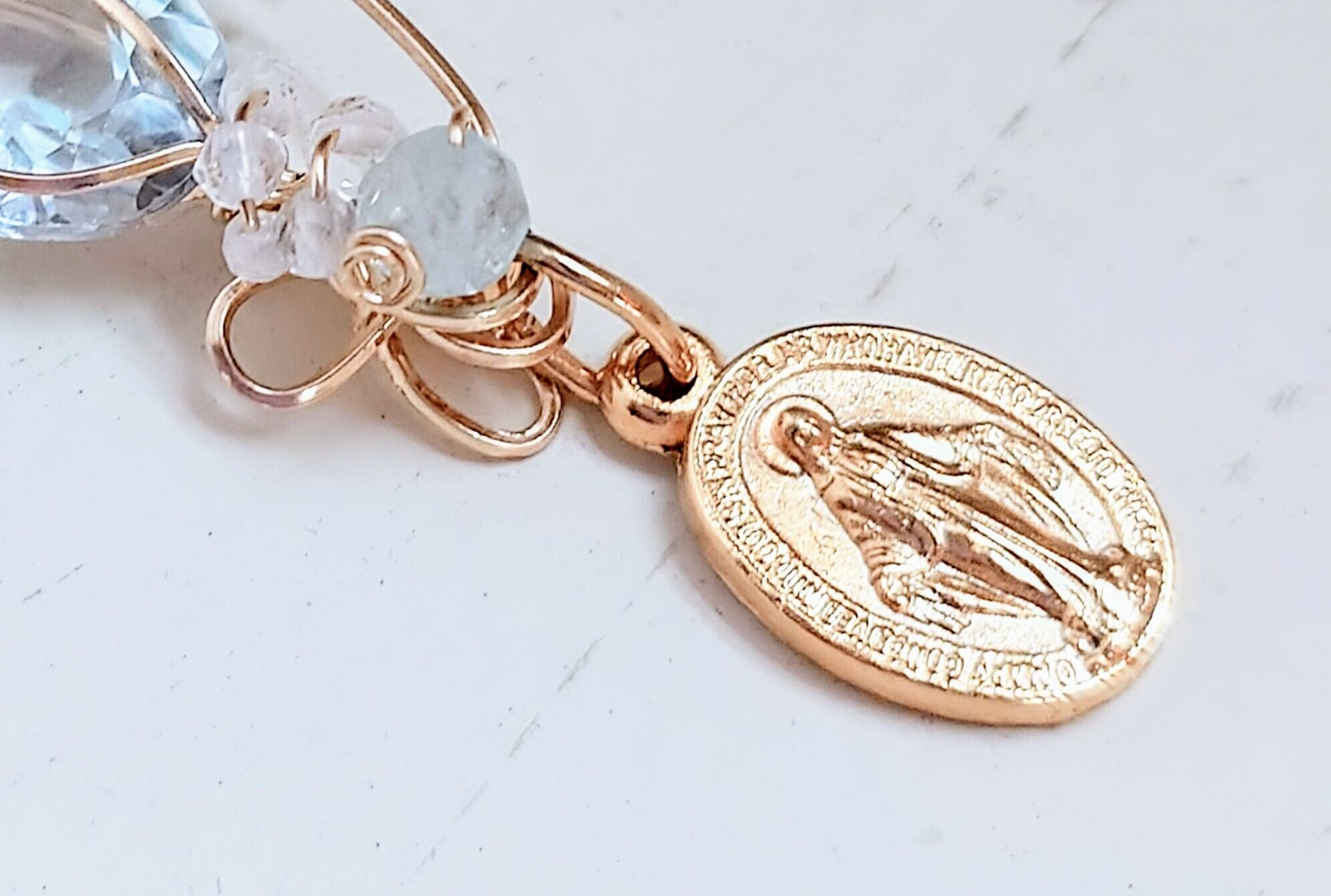 ・素材: 天然石(ブルートパーズ)、不思議のメダイ、14金ゴールドフィルドワイヤー